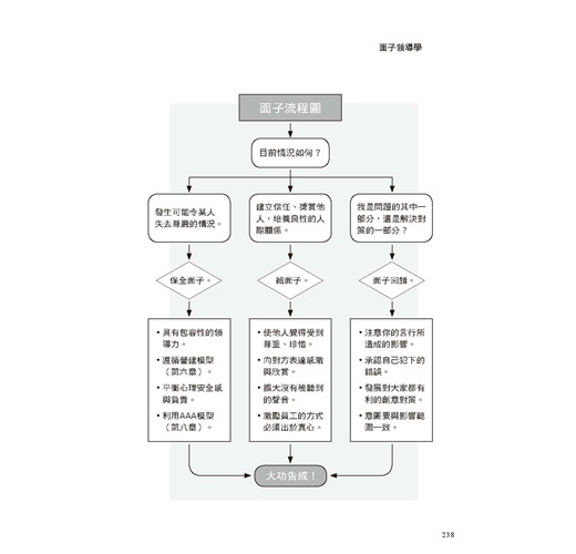 本書透過範例說明和實用工具來解釋保留面子的真諦,例如AAA模型(知覺→獲取→調整),以及BUILD模型(善意/問責、體諒、互動、學習、實踐)。