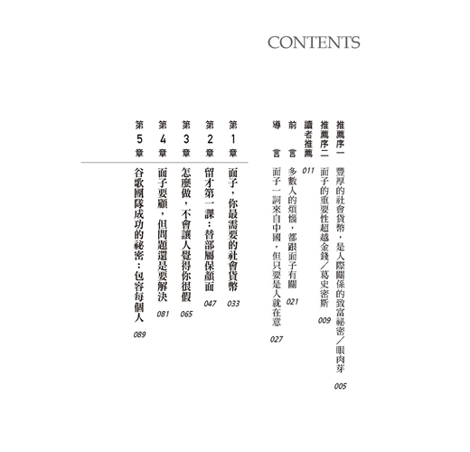 保全面子和給對方面子的能力,是我們這世代的社交貨幣。在今天的社群媒體時代,這種能力也很重要,因為欠缺面對面求證、對質的機會,很容易就會出言無狀、輕慢他人。有鑑於工作場所變得越來越複雜,本書將提供寶貴的指引與練習,供身處新經濟時代的領導者參考。