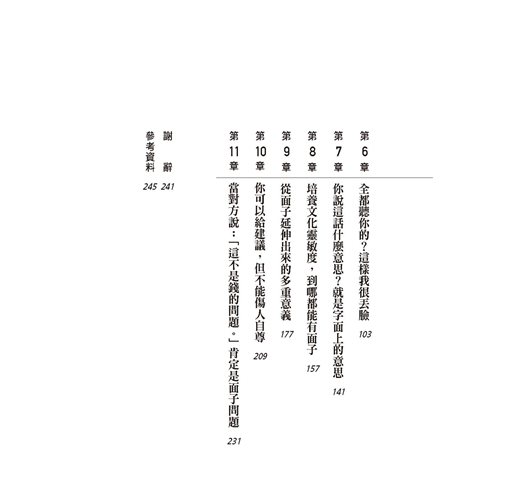 此外,我也希望這本書可以幫助想要改善人際關係的讀者,例如教師和學生的關係、家長與子女的溝通,以及其他社交情境中的人際往來。如果你願意花時間了解保全面子的重要性,就會明白面子問題幾乎涵蓋社會論述(social discourse)的所有層面,其影響無遠弗屆。