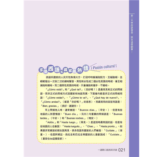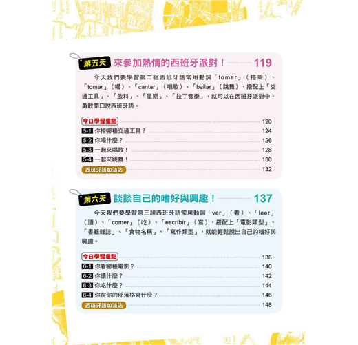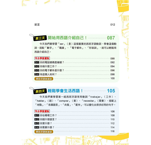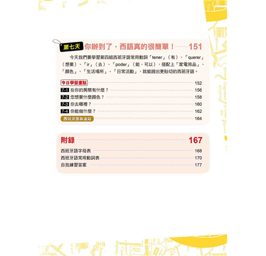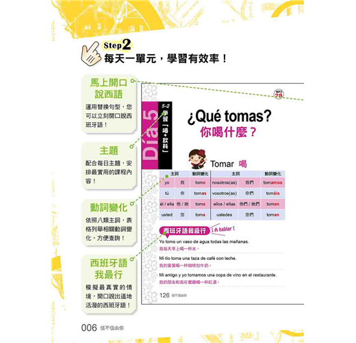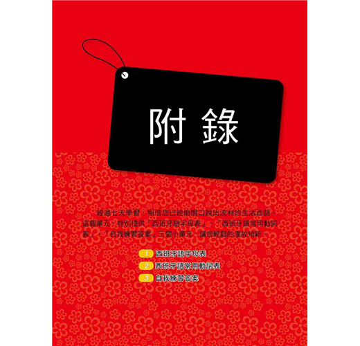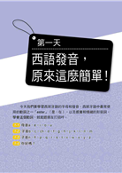 全書共分成七天,您可以依序在一週內學習完畢,也可以放慢速度仔細學習。第一天和第二天我們先學習西班牙語發音和重音,別擔心西班牙語的捲舌音,放心跟著QR Code裡的錄音檔,隨時隨地反覆聆聽,很快您就可以開口讀出並聽懂西班牙語單字和句子。從第三天到第七天,每天都介紹四個非常基本實用的西班牙語動詞,同時學習重要的基本文法和實用單字,讓您可以透過句型替換,輕鬆說出不同的西班牙語句子,立刻開口說西班牙語。