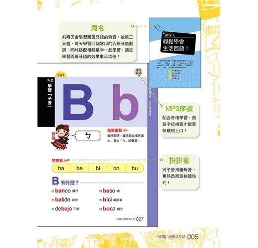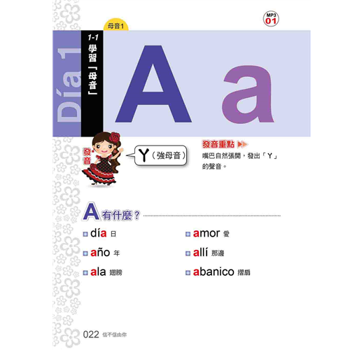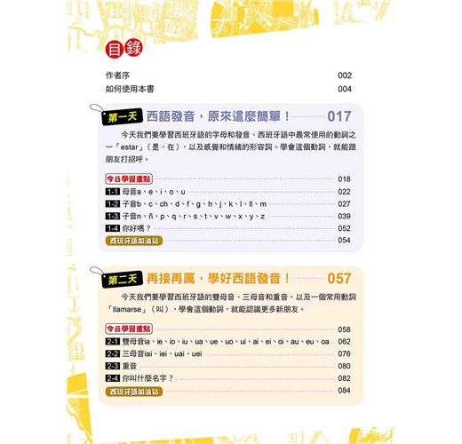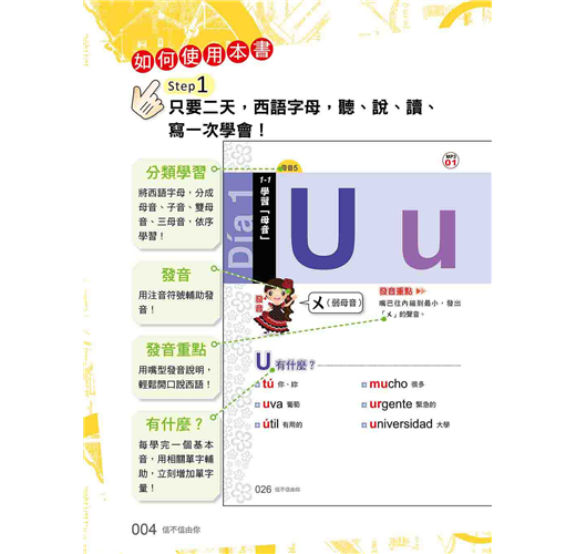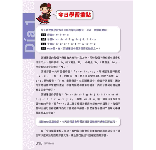 1.發音教學:從字母發音和拼音開始,將西班牙語字母分成母音、子音、雙母音和三母音,依序學習!只要二天,西班牙語字母,聽、說、讀、寫一次學會!