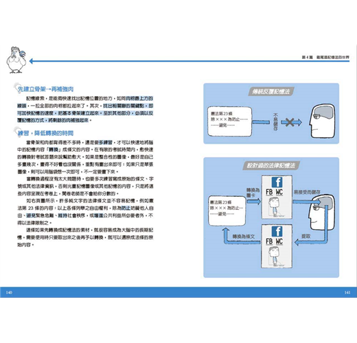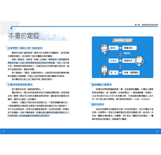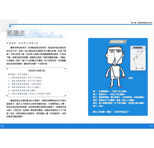 不要認為你的記憶力不好,本書透過圖像式閱讀,搭配有趣的範例,一步步帶你探索大腦記憶空間的潛能,只要你能學會本書所提到的記憶法,並活用於所想要記憶的條文,會發現記憶法不過是一種「方法」,與天分、能力並沒有太大的關聯。當你熟悉記憶創造力之後,不只是法律條文的記憶,在工作上也能享受到好的記憶能力帶來的便捷與效率。