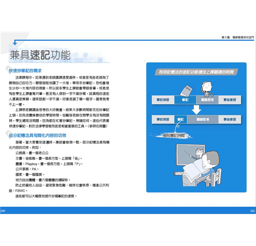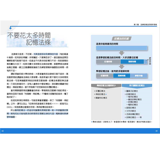 ●第一本專為法律人寫的記憶學習專書,法律範圍極大、法條又多,特別相似性的法條也不少,非常容易混淆,透過作者提供的記憶學習法,建立法律記憶模組,就能減少準備國家考試的記憶時間,有更多時間深入理解法條涵義與在申論考題中獲取高分。