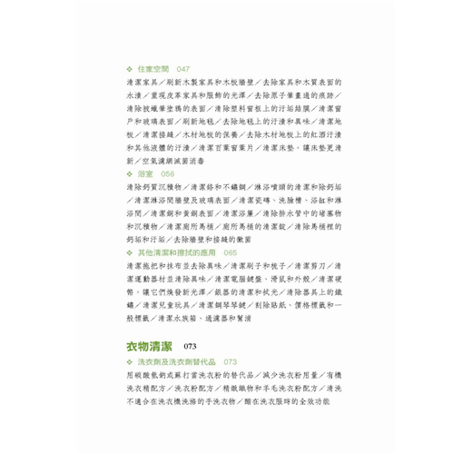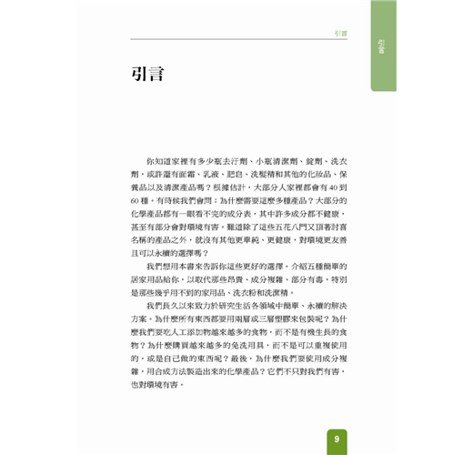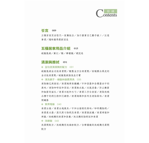 平日裡居家的清潔一直困擾著許多操持家事的人,而在疫情蔓延的時節,保持環境的清潔更是一個重大的議題。市面上有著各式各樣的清潔用品,普遍以去汙力強及具有環保概念為主要訴求,但面對著各種難以理解的化學名稱或符號,究竟這些用品是如何的有效與環保,總是讓人一頭霧水不明所以。本書以我們日常生活中常見且易取得的五樣東西。針對各種來源的污物,以不同的成分及比例調配出適合的清潔用品,明確的說明使用方法及步驟,讓清潔工作不再是一個嘗試錯誤或是幫廠商測試商品的過程。所以,以後我們不需浪費時間去試不同的清潔方法,也不用在家裡擺滿琳琅滿目的清潔用品,只需要準備這一本。