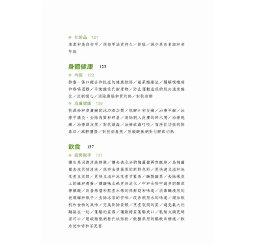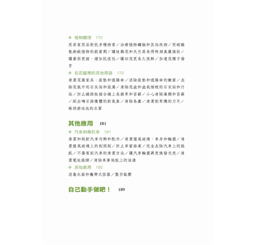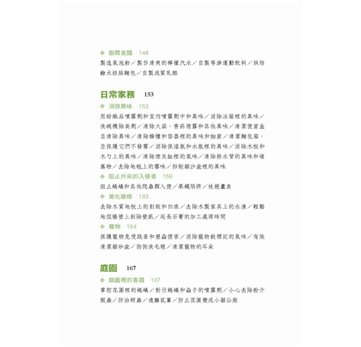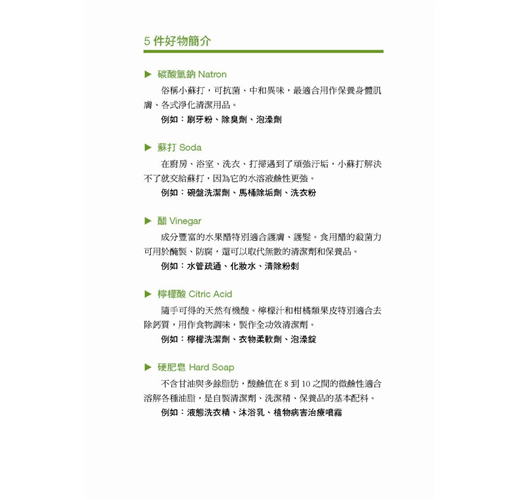 很早就開始注意友善環境的議題,因此,在我的生活中也盡量用簡單無毒的清潔劑,學習著利用酸(檸檬酸或醋)與鹼(蘇打或小蘇打)消除不同的污漬,但一直都僅限於清潔。看到這本書的第一時間,本以為一定也是清潔方面的應用,但翻閱完後,竟發現原來可以利用的面向這麼多,只要有這五件好物,不但可以清潔、可以使料理更美味、可以自製美妝保養品、可以用於園藝驅蟲……更重要的是這五件好物都方便取得,又價錢廉宜,使用後對自己或寵物都無毒無害,還能為環境永續盡一份心力。書中詳細介紹了各種功用與配方,不但適合新手入門,更適合已經在簡單使用的人,進一步學習。當看見利用小蘇打與檸檬汁就可以做出一杯檸檬汽水時,怎不讓人躍躍欲試呢!