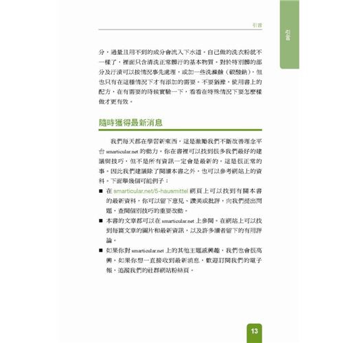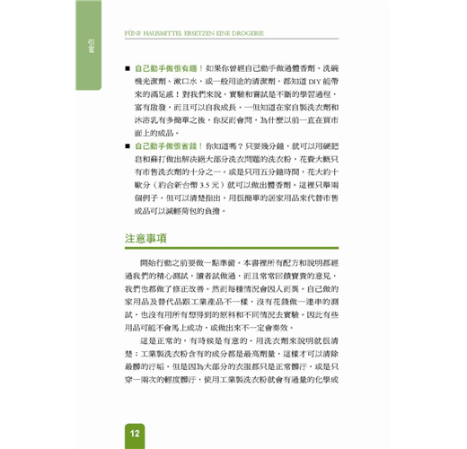 每個人家中都該有這一本。書中滿滿的寶貴建議和配方,讓家事變得更簡單、更省錢,成效更持久。現在我都自己做體香劑和洗衣粉,對自製充滿了熱情!專屬網站上有許多可以免費取得的配方,但我更喜歡最好的內容都一目了然地整理在一本書裡,不用上網就可以翻閱。——ecolibri.de讀者