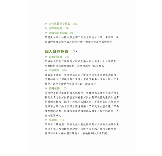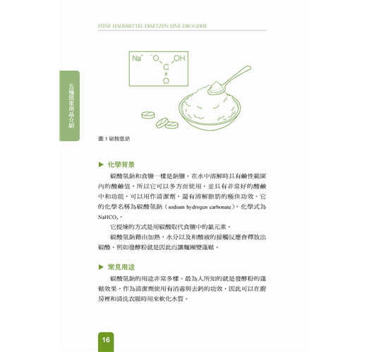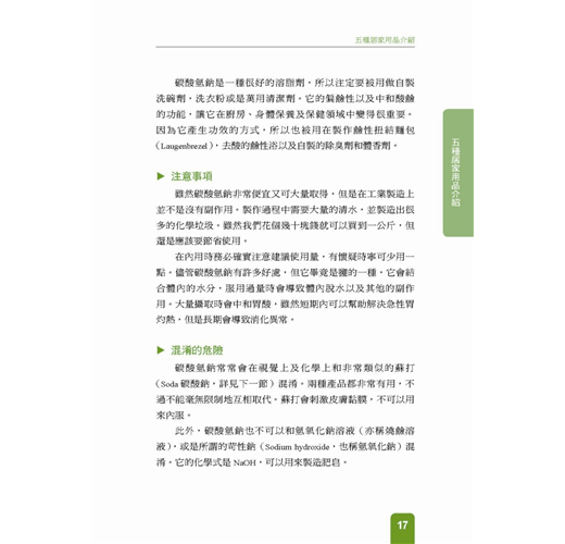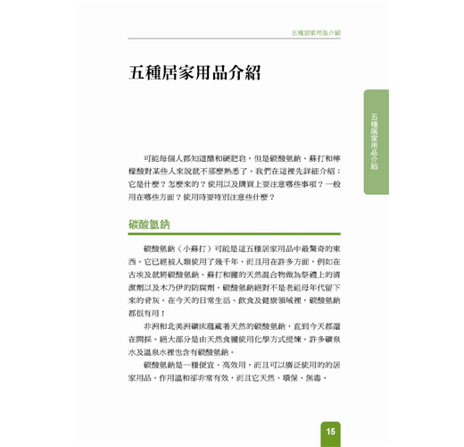 我們在書裡收集了碳酸氫鈉、蘇打、醋、檸檬酸和硬肥皂最好、最有用的用途和配方。你在第二章裡可以得知它們有哪些功效,什麼地方買得到,以及使用時應該要注意的事項。