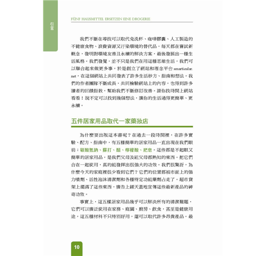 我像得到實驗積木的孩子一樣玩著書裡的方法與配方。想到過去幾十年來我都盲目相信廣告所說的,最新的清潔與護膚用品都比老式產品來得好、更有效、更溫和,我現在覺得過去的自己有點蠢。這些老東西才是真正的好物,用它們輕鬆地清除汙垢,我就快要愛上打掃了。本來很懷疑用碳酸氫鈉洗頭會如何,幸運的話也許還能洗乾淨,但是頭髮會變成稻草堆一樣難看,事實上,結果比我想像中更好。我已經迫不及待要跟著書做下一個實驗了。——amazon.de讀者Maria Tsang