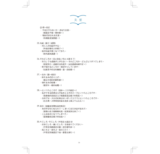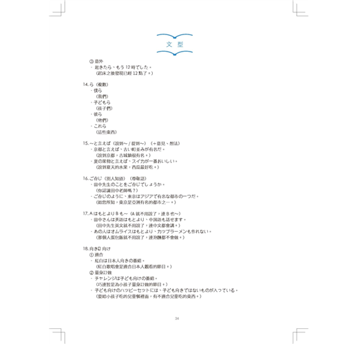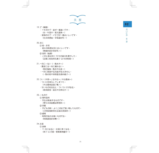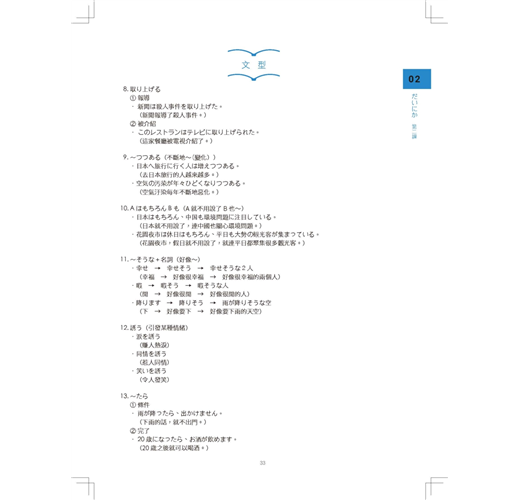 將本書所提到的文法,用辭書型的方式以五十音順序做排列,並對照課數,方便同學在課後看到熟悉的文法,可以快速查閱在哪一課有學到。