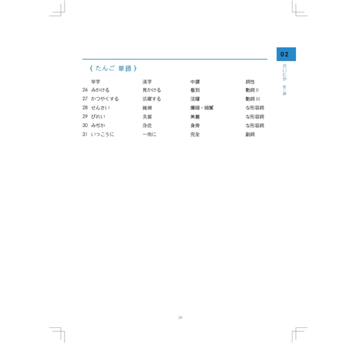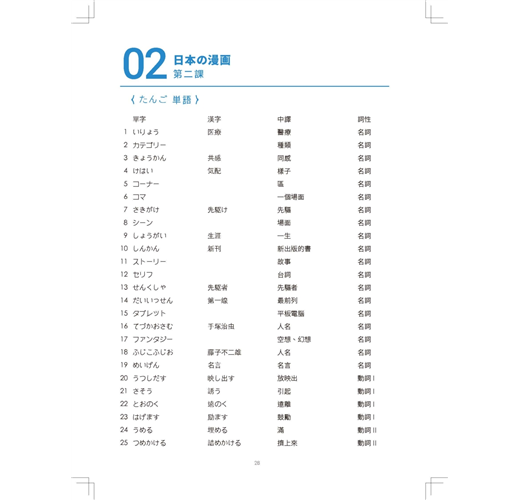 本書將中高級該學習的單字列表在每課的開頭,除了假名、漢字外,還有附上中譯、詞性,以及可以聽到純正日本人發音的QR code。不同於初級教材有音調標示,中級開始期許同學可以成長獨立,培養看到生字能自己查字典的習慣。