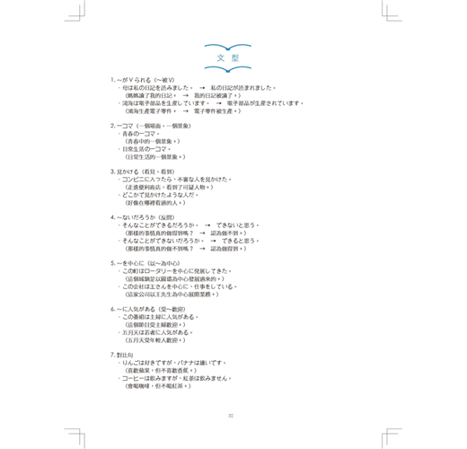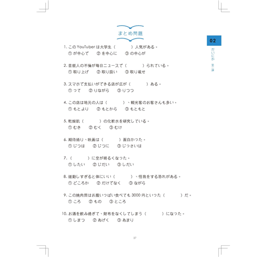 同時,每3篇文章後會有一個複習篇,複習篇題型各式各樣,主要訓練同學中高級單字的運用、文章的理解、文法的熟悉度,並在最後附上聽力練習(附音檔QR code),提高耳朵對日文的靈敏度。
