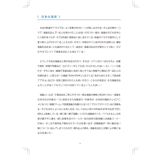 以日本文化為主軸,針對15個主題做出解說,例如:學習者能籍由中高級教科書,學會長文章的讀解、助詞的應用及長句子的拆解,培養能閱讀較簡單日文小說,或短篇文章的讀解能力。