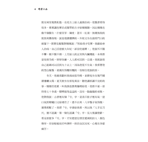 而每一次重讀琦君,都會有新的感受。譬如去年底翻閱《琦君傳‧後記》,讀到這段話便頓住了。那是李唐基伯伯告訴我的:「琦君有位年輕的忘年交,他的父親也寫作,他曾對琦君說:『我爸爸看了風景就寫詩,我對他說:奇怪,我明知是你寫的,讀起來卻像古人的詩;為什麼琦君阿姨的白話文裡也常冒出古人的詩詞,我卻覺得好像就是她自己寫的?放在那裡就是那麼恰當!』」