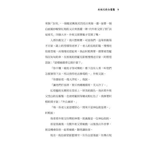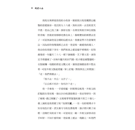 回憶、雜感、遊記是近一二年中寫的,而那些每篇不滿三千字的小小說,卻是從我好多年來所寫的當中選出八篇,我一直非常的「鍾愛」它們,過去出短篇小說集、散文集時,都無法納入,現在以小品之名,則可以兼收在內了。那些故事,除了其中的一篇以外,都不是關於愛情的。我只掇取週遭人物各式不同的形相,給他(她)們速寫一幅小像,或替他(她)們說幾句心裡想說的話。自己知道非常粗疏,但我卻很偏愛它們,因為這些人物與我,早已莫逆於心了。