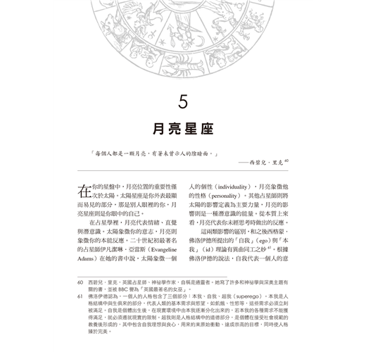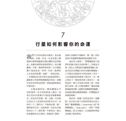 在本書中,你會學到關於太陽星座,月亮星座、上升星座、行星與宮位的所有知識,並逐漸了解這些要素之間如何相互影響,進而如何形塑你的人生。
