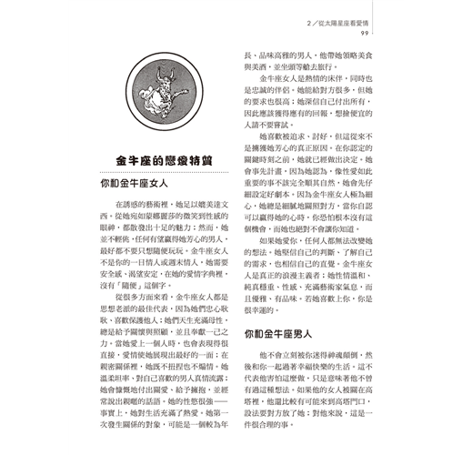 針對每個太陽星座提供「戀愛組合」的指南,12星座各自對應的愛情配對,羅列144種可能的組合,說明該星座如何與其他星座相處,邀請你對號入座。