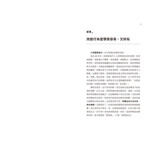 讓我告訴你:這不是你的錯。而且造就正面改變並不如你想的困難。長久以來,我們周遭充滿各種迷思、謬論,以及毫無科學根據的善意勸言,在這種環境下你注定失敗。若你曾嘗試改變卻未見效果,則你很可能認定改變非常困難,或是你缺乏動機所以無法成功。這些想法都不對。問題出在方法本身、與你無關。這麼想好了:如果你按照錯誤的說明書來拼裝抽屜櫃,而且零件也不齊全,你一定會感到很挫折,但你可能不會責怪自己,對不對?你會責怪製造商。然而,當我們嘗試改變而失敗,就不會責怪「製造商」,只會一味責怪自己。