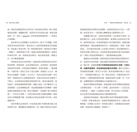 歡迎來到行為設計的世界!這是一套綜合系統,我用它來釐清人類行為,並設計出簡單的方法來改變人生。我早期在行為設計上的成果,成功協助創新者創造出無數產品,供數百萬人每日用來健身、省錢、增進行車效能等等。親眼見證用這些方法來設計商務解決方案的功效後,我把研究重點轉到個人層面:該如何改變我們自己的行為?於是我改而專攻一般人想要做出的改變。我攬鏡自照,看到許多可以改進之處。我決定嘗試每一位「共好」(gung-ho)科學家都曾做過的事——用我自己來實驗。