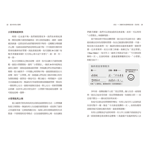 我非常樂見這些結果,於是我從2011年開始教其他人使用我的方法。讓我驚訝又興奮的是,我一開始只想在行為設計領域做個異想天開的自我實驗,沒想到卻成為正名為「小習慣」的有效方法,堪為個人轉變最快又最簡單的工具。