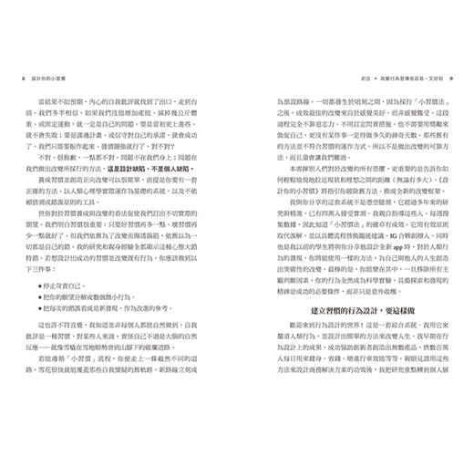 我在本書與你分享我的行為設計模型,幫助你釐清對於行為的看法。我也會說明如何用我的方法,指引你設計你的習慣。書中提及的所有模型和方法整理於附錄「行為設計:模型、方法和準則。」