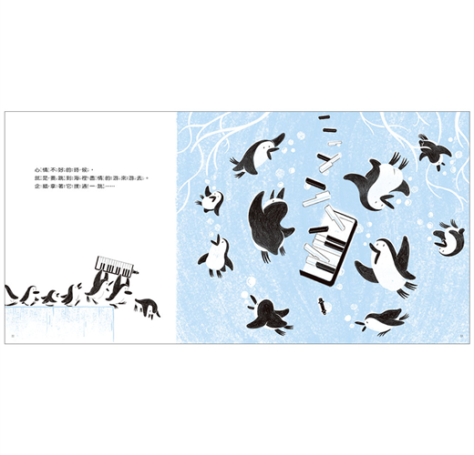 企鵝與保育員,即使言語無法溝通,依然能超越種族,找到方法傳達愛!結局企鵝排成一排好長、好長的琴鍵,黑白正面與背面的位置排列,就像口風琴的位置一模一樣,牠們拍打著肚子演奏,像似在告訴離開的保育員,是認同,是喜歡,也是期待彼此的再相見,讓故事讀著、讀著,充滿許多延續的想像空間。