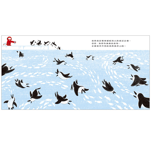 這個訴說企鵝與保育員的友誼故事,當中還藏了驚喜小彩蛋,一隻尾巴有愛心斑紋的小企鵝,身形小小的,出現在每個畫面當中,眼光常常望向保育員,讓單向的關係變成雙向的互動,也等待小讀者睜大眼睛尋找牠在哪裡,為故事增添另一番視覺辨識的閱讀樂趣。
