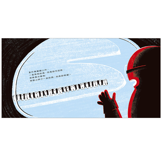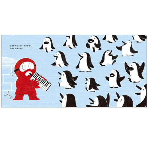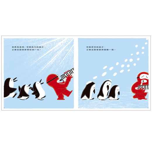 全書黑、白、紅、藍的簡單用色,設計風格強烈的構圖手法,把冷冽藍白的南極大地,孩子氣的黑白企鵝,以及保育員的紅色形象,描繪得栩栩如生,讓人如臨其境。故事中,靠著一黑一白的口風琴,像極了企鵝身上顏色的「相似物」作為媒介,讓這段友誼展開良性的互動,跟著他們開心唱和,跟著他們熟悉彼此,卻也在企鵝不小心弄壞它時,讓他們換位思考對方在自己內心的重要性。