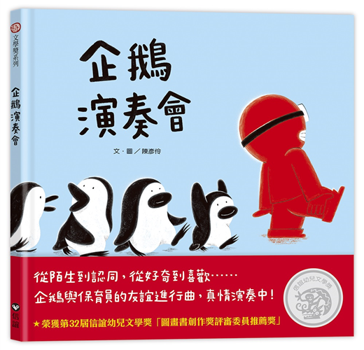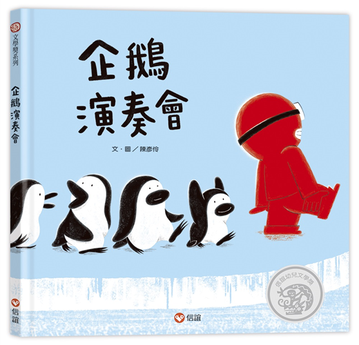 故事的畫面構圖十分傑出,巧妙運用黑、白、藍、紅四種簡單的色彩,營造出南極特有的寧靜氛圍,以及純淨的空間與視野。保育員和企鵝的形貌、姿態、動作、表情,都很吸引人。畫面中,一隻尾巴有著愛心斑紋的小企鵝,時不時的出現在保育員的身邊,他們從一開始的陌生、好奇,逐漸產生認同、喜歡的互動情感,就這麼微妙的串連起來,細細品味圖像,更增添視覺辨識與尋找的閱讀樂趣。作者選擇以口風琴作為媒介,一黑一白的琴鍵與企鵝身上的顏色相互呼應,也讓人會心一笑!整體而言,圖文契合,演繹恰如其分,結局開放有驚喜感,是一部好看、好讀的作品。
