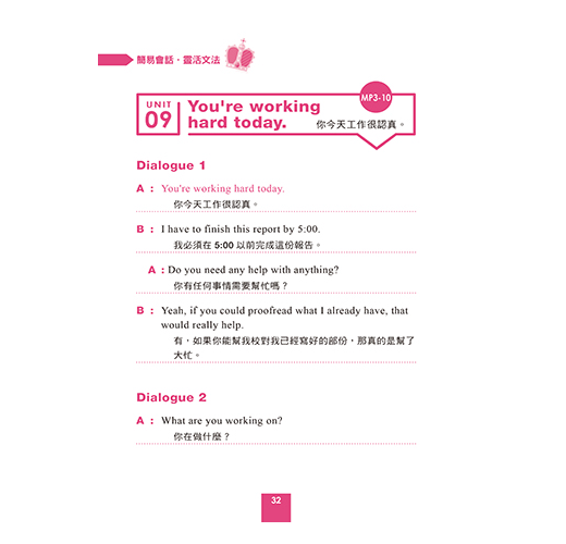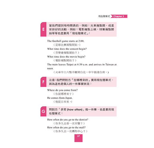 1.書中收錄9個章節的文法重點、解說,從現在進行式、現在簡單式、未來式、過去式、過去進行式、現在完成式,全都有詳細解說和互相呼應的對話,善加運用,英語實力進步神速。