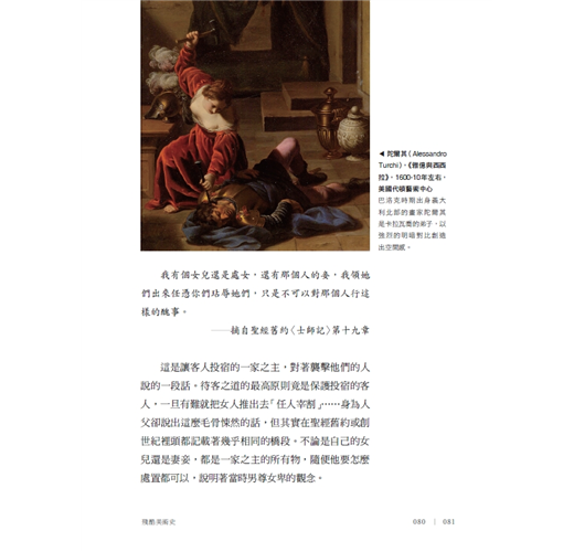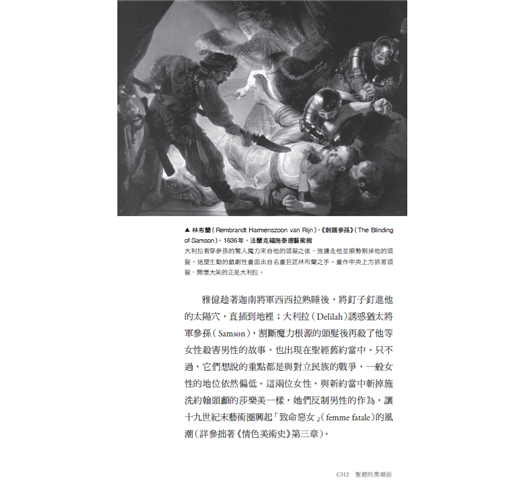 本書探討西洋美術中這些殘忍主題的歷史脈絡,深究其多樣性與多重性的意涵──第一章舉出從古至今口耳相傳的神話為例,它們正是凌虐殘暴主題的主要來源。那是一個妖怪魔物蠢蠢欲動,充滿癲狂與暴力的世界。原來這些神話故事的根源,正是這世界得以運作而生的基本守則。接下來的第二章則以聖經為主題:有時候神不近情理的殘暴更令人瞠目結舌。耐人尋味的是,這世界上最多人信仰的宗教,就是以死亡為基礎創造出來的,而且也是最具殘暴色彩的宗教。同樣在第三章一探由基督教支配的中世紀時代的各種神袐學(occult)樣貌。