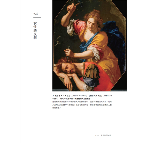 圖2裡則描繪了一名端盤子站著的女性,臉上少女般天真的表情,看似害羞的紅潤臉頰,歪著脖子直直地凝視著賞畫者,鮮明地浮現在微暗背景中的身影看起來莊嚴。然而,那只圓盤子上卻盛放著自己被割掉的乳房。