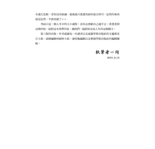 第三版的出版,作者感謝每一位讀者以及感謝學稔出版社的主編葉柔彣小姐、副總編輯林靜妙小姐、康旼甄編輯以及整個學稔出版社的編輯團隊。