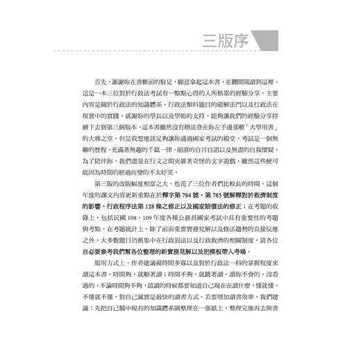 第三版的改版幅度相當之大,也花了三位作者們比較長的時間。這個年度的課文內容更新重點在於釋字第784號、第785號解釋對於救濟制度的影響、行政程序法第128條之修正以及國家賠償法的修正;在考題的收錄上,包括民國108、109年度各種公務員國家考試中具有重要性的考題與考點。在考題統計上,除了前面重要實務見解以及修法趨勢的直接反應之外,大多數題目仍舊集中在行政罰法以及行政救濟的相關制度,請各位務必要參考我們幫各位整理的新實務見解以及把模板帶入考場。