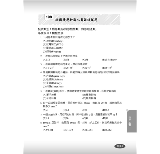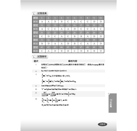 書末收錄105~109年各類考試,不論國營事業或鐵路特考皆囊括在內,力求一網打盡機械原理、機械概論諸多考題。考古題的重要性不言而喻,經歷考古題的洗禮,是考生實際上場應試前不可或缺的階段。