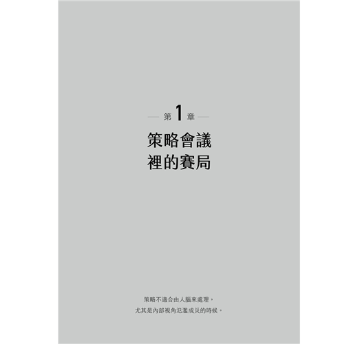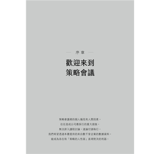 【導讀】 序章 歡迎來到策略會議 策略會議裡的個人偏見和人際因素,往往造成公司應採行的重大措施,無法排入議程討論,遑論付諸執行。我們希望透過本書提供的來自數千家企業的數據資料,能成為各位和「策略的人性面」直球對決的利器。 「難道沒有其他更優質的策略制定方法嗎?」我們常聽到這句話,你肯定也問過自己同樣問題,可能還不止一次。時間點也許是某次馬拉松式的策略會議之後—這種會議原本是為了多方討論,但往往只是一場接一場的簡報;也許,是在面對一個前景未明的投資提案卻被迫投下贊成票之後;抑或是,為了發展業務針...