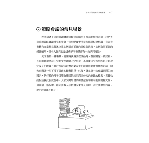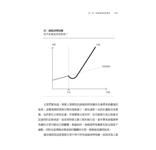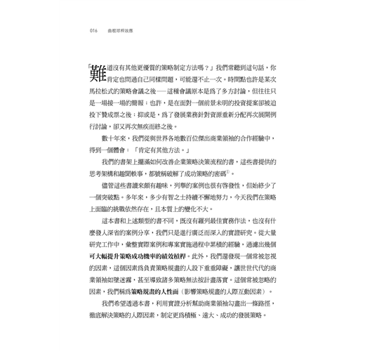 【導讀】 序章 歡迎來到策略會議 策略會議裡的個人偏見和人際因素,往往造成公司應採行的重大措施,無法排入議程討論,遑論付諸執行。我們希望透過本書提供的來自數千家企業的數據資料,能成為各位和「策略的人性面」直球對決的利器。 「難道沒有其他更優質的策略制定方法嗎?」我們常聽到這句話,你肯定也問過自己同樣問題,可能還不止一次。時間點也許是某次馬拉松式的策略會議之後—這種會議原本是為了多方討論,但往往只是一場接一場的簡報;也許,是在面對一個前景未明的投資提案卻被迫投下贊成票之後;抑或是,為了發展業務針對資源重新分配再次展開例行討論,卻又再次無疾而終之後。 數十年來,我們從與世界各地數百位傑出商業領袖的合作經驗中,得到一個體會:「肯定有其他方法。」 我們的書架上擺滿如何改善企業策略決策流程的書,這些書提供的思考架構和趣聞軼事,都號稱破解了成功策略的密碼。 儘管這些書讀來頗有趣味,列舉的案例也很有啟發性,但始終少了一個突破點。多年來,多少有智之士持續不懈地努力,今天我們在策略上面臨的挑戰依然存在,且本質上的變化不大。 這本書和上述類型的書不同,既沒有羅列最佳實務作法,也沒有什麼發人深省的案例分享,我們只是進行廣泛而深入的實證研究。從大量研究工作中,彙整實際案例和專案實施過程中累積的經驗,過濾出幾個可大幅提升策略成功機率的績效槓桿。此外,我們還發現一個常被忽視的因素,這個因素為負責策略規畫的人設下重重障礙,讓世世代代的商業領袖如墜迷霧,甚至導致諸多策略無法按計畫落實。這個常被忽略的因素,我們稱為策略規畫的人性面(影響策略規畫的人際互動因素)。 我們希望透過本書,利用實證分析幫助商業領袖勾畫出一條路徑,徹底解決策略的人際因素,制定更為積極、遠大、成功的發展策略。 ▌當策略的人性面作祟 眾所周知,策略的決策流程不可避免地摻雜個人或制度上的偏見,而策略會議裡的集體因素往往也會讓結果產生偏差。我們對人際因素的思考通常僅止於此。曾幾何時,我們會認真思考一下這些因素的影響,並採取適當的行動呢?通常情況下難道不是聳聳肩,然後繼續推進手頭的方案嗎?我們往往假裝策略決策流程不過是為了解決一個分析性的問題,但內心卻深知,分析其實是最簡單的環節。 一般商業書籍或諮詢專案提供的思考架構和工具,對於構建思維模式、形成一些想法是有幫助,但是,光靠它們還是無法突破真正的障礙,最終制定出優秀的策略。原因很簡單:策略的人性面遠遠壓制了智識層面的因素。彼得.杜拉克有句名言:「文化能把策略當早餐吃。」這在策略會議裡展現得最為明顯。怎麼會這樣呢?負責制定策略的人不都聰明絕頂且經驗豐富,樂於接受智力上的挑戰嗎?但在這個會議室裡,策略並非唯一的重點。工作,甚至事業,都在策略的影響範圍內。過度承諾或無法達成績效目標,都有可能導致工作不保或危及自己在公司裡的地位。這麼一來心態不免轉為保守,以保住工作為出發點的策略流程,自然也就無法為公司帶來最好的結果。預算流程也是干擾因素之一,現在大家或許在討論一個為期5年的發展策略,但大家都知道,真正重要的是第一年的預算─這就難免會涉及一些「小心機」,例如多數主管都會努力確保來年的資源,同時盡可能推遲檢驗這些投資報酬率的時限,甚至推遲到大家都忘了最初訂下的承諾或目標,或者這些主管自己都已輪調到其他部門。畢竟,最成功的商業領袖也是人。 策略會議裡充滿許多相互衝突的待辦事項和人際心機,以至於你有時候甚至會好奇,一開始花那麼多時間和精力分析問題、準備簡報,到底有什麼意義。 以上所有因素最終會交互作用,呈現出所謂的曲棍球桿效應,在明年預算出現再熟悉不過的下降曲線後,信心滿滿地展示未來的成功。確實,如果要給策略決策流程找一個象徵圖示,肯定非曲棍球桿獨特的曲線莫屬。只要提到這個詞,那些看過我們研究的高階主管就會面帶苦笑地投來會心的一瞥。我們希望用這本書,破除曲棍球桿效應,解決策略中的人際因素問題,使企業能夠真正採取果決的行動來提升經濟利益和股東價值。