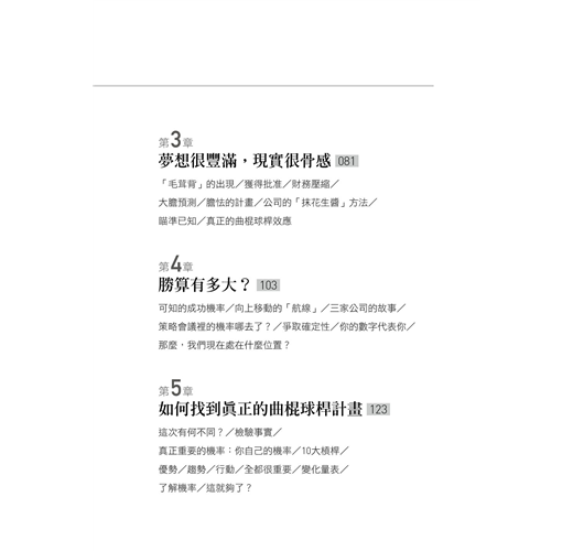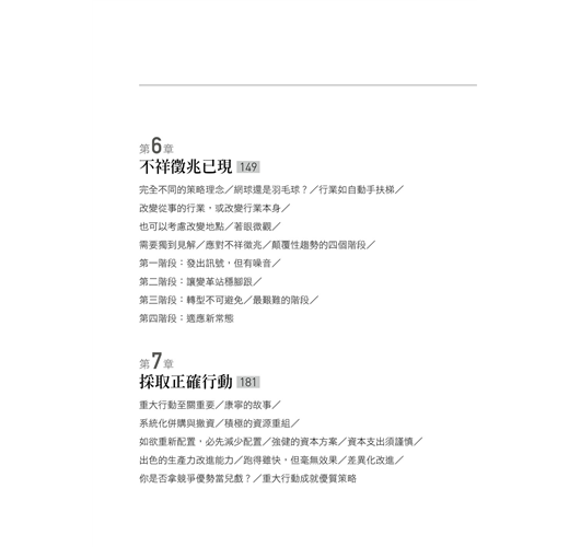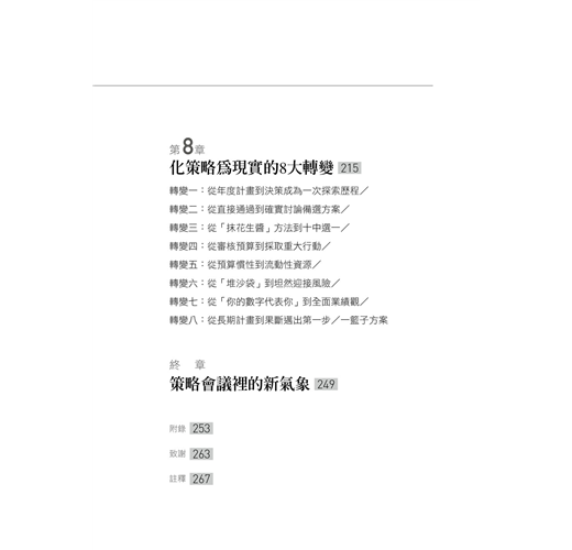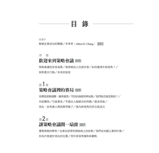 推薦序 解鎖企業成功的關鍵/章錦華 序 章 歡迎來到策略會議 第1章 策略會議裡的賽局 第2章 讓策略會議開一扇窗 第3章 夢想很豐滿,現實很骨感 第4章 勝算有多大? 第5章 如何找到真正的曲棍球桿計畫 第6章 不祥徵兆已現 第7章 採取正確行動 第8章 化策略為現實的8大轉變 終 章 策略會議裡的新氣象 附 錄 致 謝 註 釋