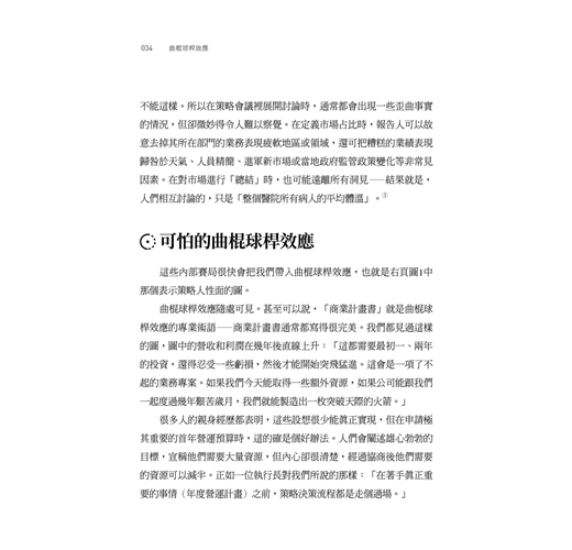 第1章 策略會議裡的賽局 很多公司在規畫策略之初,都會向員工發送一封如下方那樣的備忘錄。你不只見過,甚至還可能親筆寫過。為此,你和同事會花好幾個月時間著手很多工作,運用複雜的工具,獲取大量資訊,使用可觀的資料。這封備忘錄本身非常簡單。 備忘錄發出之後,再經過長達數月的工作,你通常會對市場現狀有了深刻的理解,並知道選擇怎麼做來應對此種現狀。於是,執行長帶頭展開一系列討論,規畫出某項策略並得到董事會的認可。之後,你開始做預算⋯⋯但結果卻收效甚微。 這通常不會引發嚴重問題。你很少會遇到像柯達、百視達或諾基亞公司那樣攸關生死存亡的絕境,這些著名案例引起廣泛關注,一定程度上是因為這種情況非常罕見。然而,即使某項策略如預期取得了所謂的「成功」,其帶來的效益往往也不明顯。 這種策略很少能推動企業實現向正確方向的大幅改進,至少短期來看是如此。通常問題並非像是火箭在半空中脫離軌道,而是沒能給登月發射器提供充足燃料。你花了那麼多時間和精力,但過去一年究竟取得多少成績? ▌目標是提案過關,獲得資源 內部視角形成一個名副其實的培養皿。一旦發出策略備忘錄,各種各樣的功能紊亂便會隨之而來,於是便有了我們都曾目睹過的這般場景。 在進行策略討論前的那個周六,執行長收到一份需要事先閱讀的檔案,裡面是一份150頁的冗長文件,外加很多附錄。這位執行長知道,即將開始的這場討論不會有太多實質性內容。相反地,整個過程不過是某位主管精心策畫的一場表演,目的是為讓自己的策略提案和資源申請獲得批准。 周一早晨,該場會議的專案報告人首先展望市場前景,並介紹當下的競爭格局。有人提出一個跟第5頁的內容有關的問題(我們認為,報告人在被打斷前完全有機會講到第5頁,而這時以策略人性面展開的戰爭便開始了)。報告人的答覆可能是:「我們會在第42頁談到這個問題。」—當然,他很清楚到會議結束時恐怕都講不到第42頁(如果真的有第42頁的話)。他也可能回答:「我們已經考慮過這個問題,有份完整的附錄專門闡述此事。」或者,「問得好!但我們暫時先不討論這個問題。」 我們應該都見過這種社交技巧吧? 通常來說,策略會議上的報告人根本不希望展開對話。反之,他們好像會盡可能迴避問題,他們會想辦法順利地講到最後一頁,然後希望這項計畫過關,讓資源申請獲得批准,甚至為下一次升職鋪路。 如果把策略陳述的過程稍微加快一點,下面就該討論市場占比的具體表現,或者對優勢和劣勢進行分析。這項計畫有多大可能會顯示其市場占比反而會偏低,或處於下滑之中呢?如以SWOT分析來看的話,會花多少篇幅來闡述劣勢?儘管我們知道,並非每一家公司都能在市場中獲勝,但這些分析看起來似乎都很有道理。如果一家公司奪取市場占比、獲得優勢,其他公司必然蒙受損失。報告人有多大可能得出這樣的結論:不值得對自己的業務展開進一步投資,公司應考慮重新將資源投向其他業務,削減規模甚至退出現有業務呢?在策略陳述中,從來沒有發生過此種情況,似乎所有人都是贏家,而且每次都是如此。 當然,執行長並非傀儡。他們早就見過這種把戲,很多執行長承認,他們自己也曾玩過這樣的把戲,在把自己的計畫提交給董事會之前,會淡化其中的風險因素。 即使那樣,報告人還是可透過內部視角操縱資料。舉例來說,對其業務部門進行陳述的報告人比在座所有人在知識方面都擁有明顯優勢。比如,以事後諸葛角度來看待過去的業績應該非常簡單──但實際上卻不能這樣。所以在策略會議裡展開討論時,通常都會出現一些歪曲事實的情況,但卻微妙得令人難以察覺。在定義市場占比時,報告人可以故意去掉其所在部門的業務表現疲軟地區或領域,還可把糟糕的業績表現歸咎於天氣、人員精簡、進軍新市場或當地政府監管政策變化等非常見因素。在對市場進行「總結」時,也可能遠離所有洞見──結果就是, 人們相互討論的,只是「整個醫院所有病人的平均體溫」。 ▌可怕的曲棍球桿效應 曲棍球桿效應隨處可見。甚至可以說,「商業計畫書」就是曲棍球桿效應的專業術語──商業計畫書通常都寫得很完美。我們都見過這樣的圖,圖中的營收和利潤在幾年後直線上升:「這都需要最初一、兩年的投資,還得忍受一些虧損,然後才能開始突飛猛進。這會是一項了不起的業務專案。如果我們今天能取得一些額外資源,如果公司能跟我們一起度過幾年艱苦歲月,我們就能製造出一枚突破天際的火箭。」 很多人的親身經歷都表明,這些設想很少能真正實現,但在申請極其重要的首年營運預算時,這的確是個好辦法。人們會闡述雄心勃勃的目標,宣稱他們需要大量資源,但內心卻很清楚,經過協商後他們需要的資源可以減半。正如一位執行長對我們所說的那樣:「在著手真正重要的事情(年度營運計畫)之前,策略決策流程都是走個過場。」 主管們都知道,事實上預測性的曲棍球桿效應往往會帶來更嚴重的後果。這種預測把清算日期向後推遲了。誰知道呢?也許計畫能完美實施;也許那位主管很走運,市場環境又很有利;也可能執行長以後會忘記當時的宏偉承諾,或者到時候又換了新的執行長;當年帶來曲棍球桿效應的主管可能也已經離職。無論如何,曲棍球桿效應都有助支撐當下論點,同時也是策略決策流