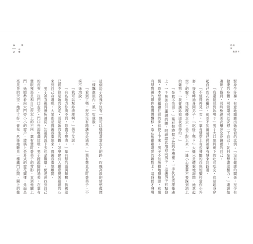 「謝謝。你吃完就走吧,不吃就直接離開。」葉有慧淡淡地說,然後轉身自顧自地打開只有半扇門的衣櫃,另一扇門在她搬進來以前就不見了。她身上有許多東西都是早早就不見了的,有一種跟這個衣櫃惺惺相惜的感覺,很溫馨,所以不用換喔,她簽約時曾這麼跟房東太太說,您不需要特別幫我換一個新的衣櫃,語調裡帶著她看似與生俱來的禮貌,畢竟她也不是新的。禮貌只是維持新舊平衡的距離。整個房子裡唯一的新東西是衣櫃那半扇門後面,掛著好幾件昂貴的未剪牌新衣,已經跟著葉有慧好幾年,一直都沒有穿,放著放著也有了變舊的感覺。