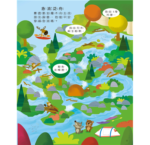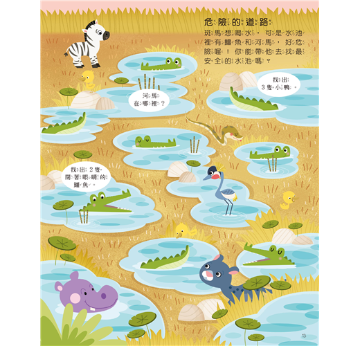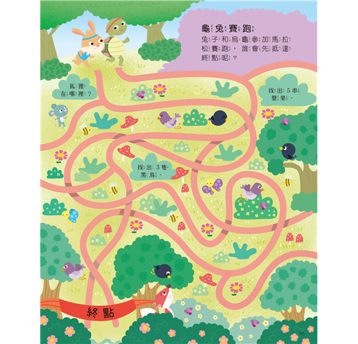 請小朋友一邊動動腦,幫助可愛的主角避開障礙,達成目標;一邊找找隱藏的物品和動物喔!