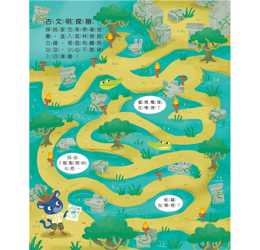 許多令人意想不到且看不出怎麼走的創意迷宮,例如頭髮、衣服、文具用品等,小讀者要善用眼力與想像力才能看出路徑。