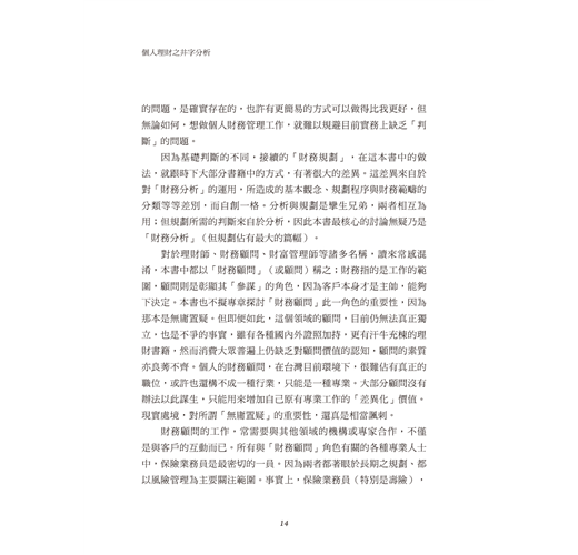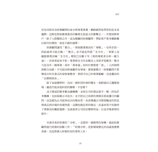 我讀的是中文系,沒有商學院的背景。當時喬治亞人壽的副總黃元凱先生,有天竟然要所有業務員都得學「貨幣時間價值」,因為公司從國外引進一套分析客戶需求的方法,需要懂得這最基礎的財務知識。他親自授課,一次課程上兩天,我一共上了三次。因為沒有基礎,不容易聽懂那些計算,許多同仁也是叫苦連天,但當時我卻感到無比震驚與興奮,看到我想要的答案,就藏在這堪稱基礎的知識中。國外引入的那套需求分析系統,實際使用的時間不長,後來只剩下紙本作業,電腦則擱置不用,但這門課開啟我的視野,讓我找到困擾多年問題的答案。那答案慢慢發展成為這本書的架構、方法與操作基礎,涵蓋的範圍也不再限於那原始的問題。對元凱副總的感謝,他並不知道,因為公司後來與安泰合併,他也離開公司,慢慢的疏遠彼此的聯繫,利用這本書的付梓,特地表達對他當初堅持教導我們這群門外漢的感激,他一定沒想到,那門課直接影響我往後多年的系統發展,身為保險公司市場部的副總,卻親身授課,而且還上了好幾梯次,沒有交代給訓練部去做,更要求所有人員都得參加課程,我想這肯定是前無古人了。