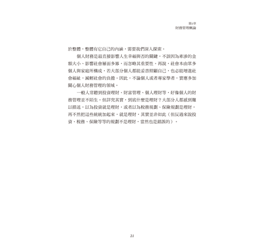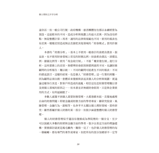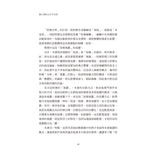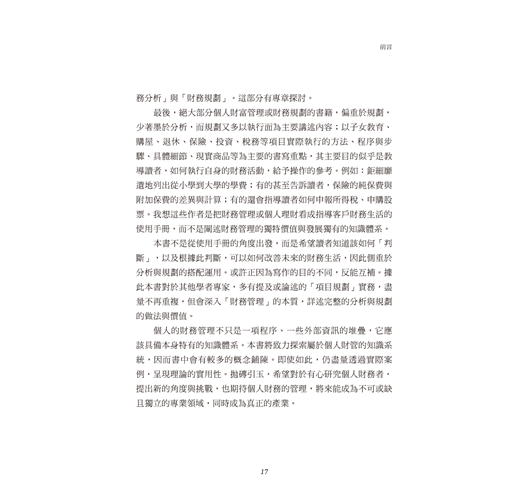 寫這本書並非一時興起,實構思多年,只是始終未能真正下筆。至少有十年時間,書寫的內容不斷改變,那是無法控制的變化,好像這套體系有自己的生命,緩慢但從未停止成長,隨著授課、或實際碰到的個案而變動;而且每次想寫下某個觀念,就發現這個觀念與其他不少觀念相互糾結,難以切開,更糟糕的是今天好不容易寫好的東西,明天再看竟變得漏洞百出,常常整篇刪除重寫,然後不斷重複這個過程。這是因為自己沒有徹底掌握內容吧,與其說是我創作了這本書,還不如說是這本書重新教育了我,在寫作的過程中,我對個人理財的知識體系更加理解,許多舊觀念的釐清,新觀念的產生,都來自這本書對我說話。