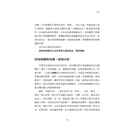 這套系統對增加保險業務員的銷售額,可能沒太多的幫助。因為收集與分析客戶的資料,並提出相關報告,頗花時間,客戶極少有耐心陪著業務員慢慢探索自己的財務狀況;而資料收集涉及更多的隱私,也增加溝通的難度,所以從開始闡述本系統以來,總是曲高和寡,市場反應冷淡。但仍有少數學員堅持為客戶進行財務的分析與規劃,令人感動。直到寫完這本書,才更確定這套系統不是專屬於保險業務員的專業範疇,它的目的在於提升客戶財務生活,而非單純賣出保單,或增加客戶保障。如果客戶的目的只是想買保險,自然對此不感興趣,除非他意識到這麼做,對他的好處遠勝過買保險的單一決策。