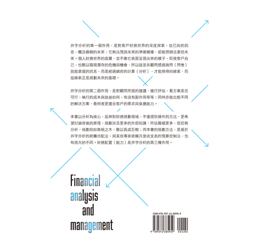 本書以分析為核心,延伸到財務規劃領域,不僅提供操作的方法,更希望討論背後的原理,規劃涉及更多的外部知識,所佔篇幅更多,但若無分析,規劃宛如無根之木,難以長成巨樹;而本書的規劃方法,是基於井字分析的統籌分配法,與某些專家依賴月度收支表的預算控制法,也有很大的不同。財務配置(能力)是井字分析的第三種作用。