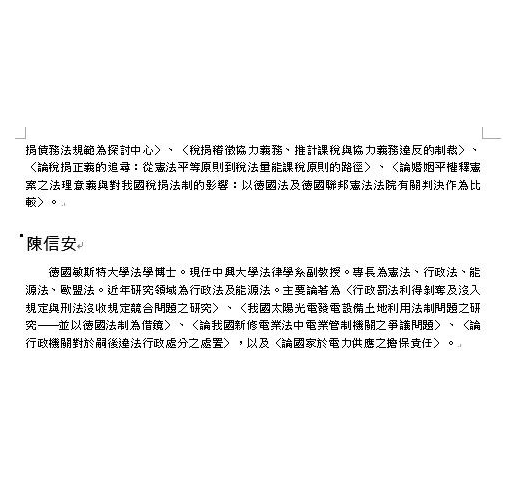 德國敏斯特大學法學博士。現任中興大學法律學系副教授。專長為憲法、行政法、能源法、歐盟法。近年研究領域為行政法及能源法。主要論著為〈行政罰法利得剝奪及沒入規定與刑法沒收規定競合問題之研究〉、〈我國太陽光電發電設備土地利用法制問題之研究──並以德國法制為借鏡〉、〈論我國新修電業法中電業管制機關之爭議問題〉、〈論行政機關對於嗣後違法行政處分之處置〉,以及〈論國家於電力供應之擔保責任〉。