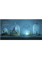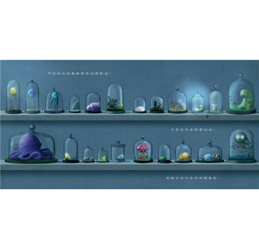 標本、燒杯、玻璃罩、外露管線、斑駁生鏽的水箱,在理性與魔法共存的地下實驗室裡,在霓虹燈閃爍的城市中,小怪獸的眼睛、尾巴,罩子裡的草地與玻璃罩的反光,黑暗中仍處處透著微光,令人目眩神迷。彷彿只要願意相信,希望與魔法其實一直都在。
