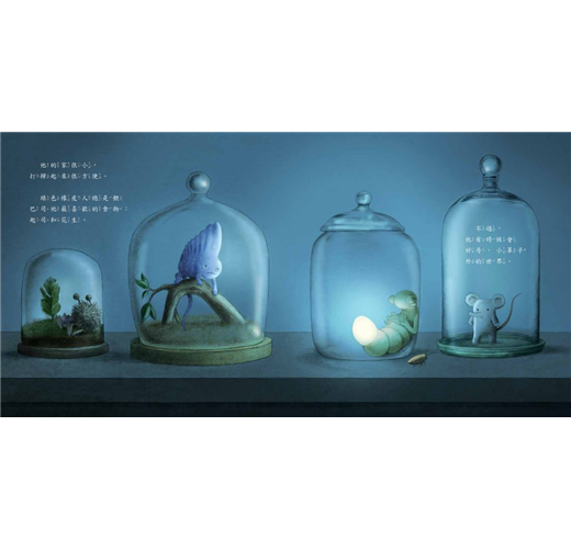 書衣──禁錮與反抗:貼著玻璃罩、被禁錮的老鼠般大小大象,卻有著炯炯有神的雙眼。雖以深藍色為主色調,卻能隱約看見一道溫柔光束從左上方照射下來,讓玻璃罩微微反光,透漏著希望即將到來。翻到書衣封底,果然已人去樓空!玻璃被打碎,小怪獸也不知去向,他跑去哪裡了呢?反抗成功了嗎?