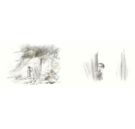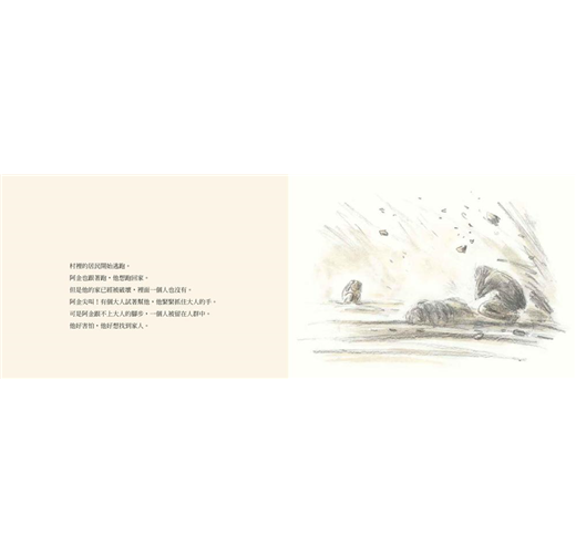 杜柏成熟的速寫筆觸,以黑、灰、米黃等近乎無色彩的色調,刻畫平民面對戰爭的迷惘心情;以恰到好處的力道,描寫戰爭的殘酷,而不會讓孩子過於恐懼。杜柏繪出倒在地上的傷亡者、殘破的屋瓦、無家可歸的人們相互依偎、難民長途跋涉、陌生人的救援等,這些彷彿旅記般的連篇圖畫,讓孩子在一頁頁翻開阿金的旅程時,有時間慢慢理解、觀察與體會。這本書傳遞給孩子一個真實的訊息,同時也提供家長合適的切口,與充滿困惑、關心世界的孩子,討論這個須被認識的議題。