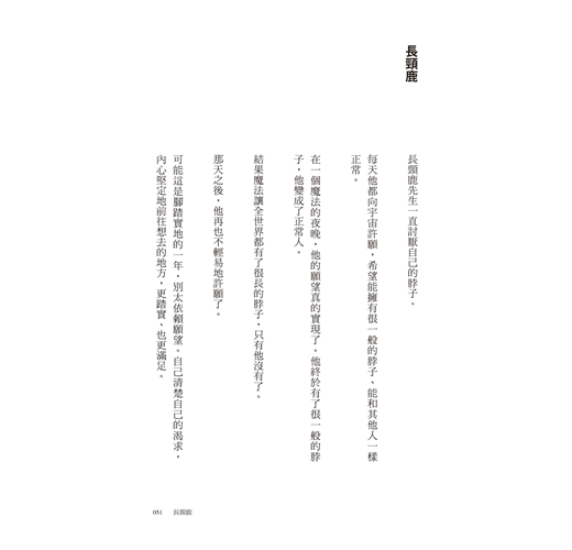 〈登高〉〈生活〉〈太陽先生給谷底的一封信〉〈壞眼淚〉〈回診〉〈小山的肩膀〉〈魚的七秒記憶〉〈大漩渦〉〈快樂的秘訣〉〈逃跑的人〉〈一場不可思議的實驗〉〈當你看向月亮時他不會對你說謊〉〈我很好〉〈想太多〉〈恐龍不會說話〉〈害怕的時候〉
